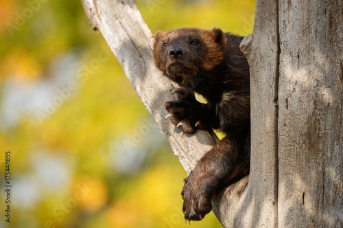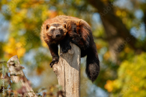 Majestic Wolverine Hang On A Tree In Front Of The Colourful